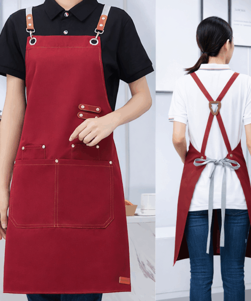 Tạp dề màu trung tính thanh lịch, thiết kế dây chéo lưng hiện đại.