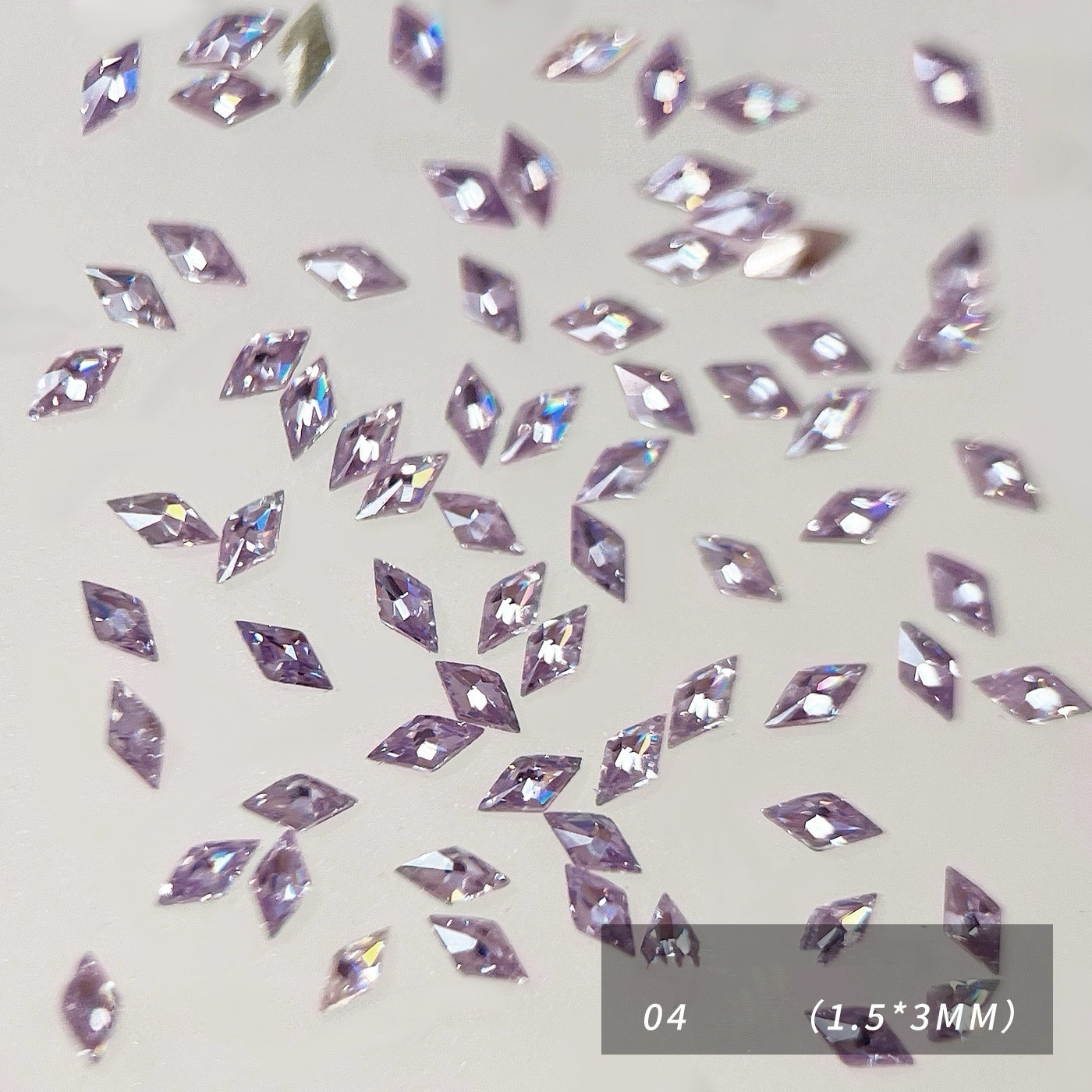 Đá đính móng zircon màu tím với bề mặt cắt tinh xảo, tạo hiệu ứng lấp lánh nổi bật trên móng. Thiết kế đa dạng kiểu dáng giúp dễ dàng sáng tạo nhiều phong cách nail từ nhẹ nhàng đến sang trọng.