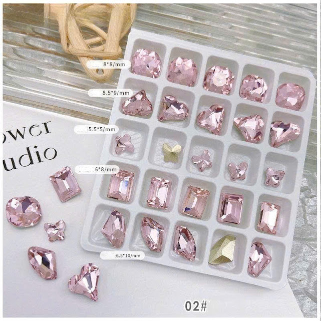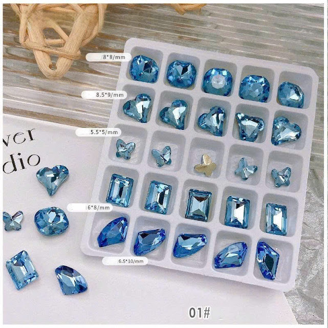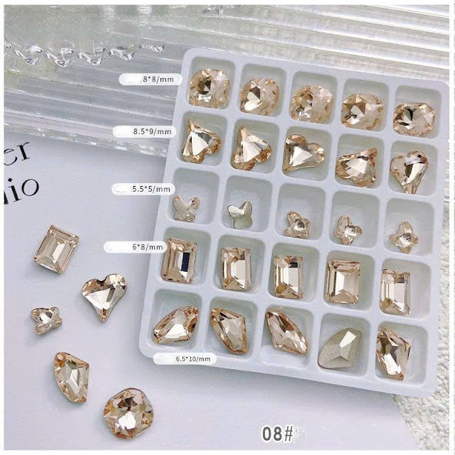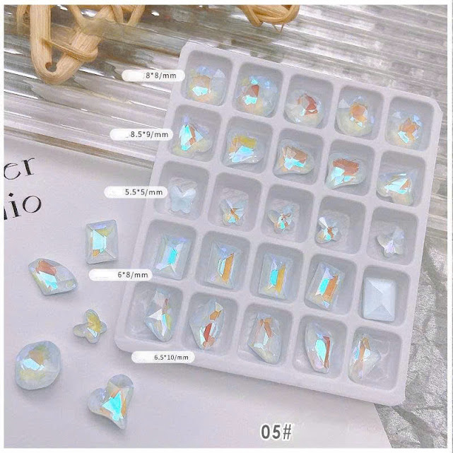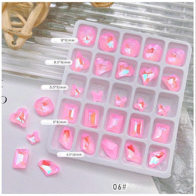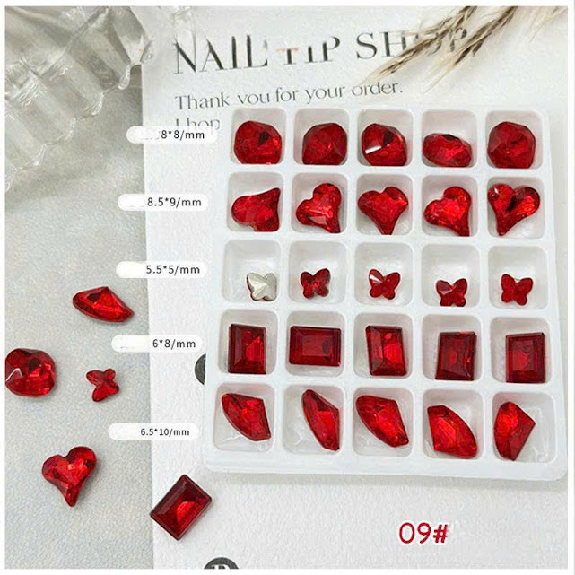 Bộ phụ kiện nail C0067 gồm 25 mẫu charm đá đa dạng hình dáng như trái tim, vuông, giọt nước, oval và các họa tiết đính đá tinh tế, giúp tạo điểm nhấn nổi bật cho bộ móng. Sản phẩm được thiết kế với tông màu thanh lịch như xanh nhạt, hồng, trắng, mocha, đỏ và trong suốt, phù hợp nhiều phong cách từ nhẹ nhàng đến cá tính.