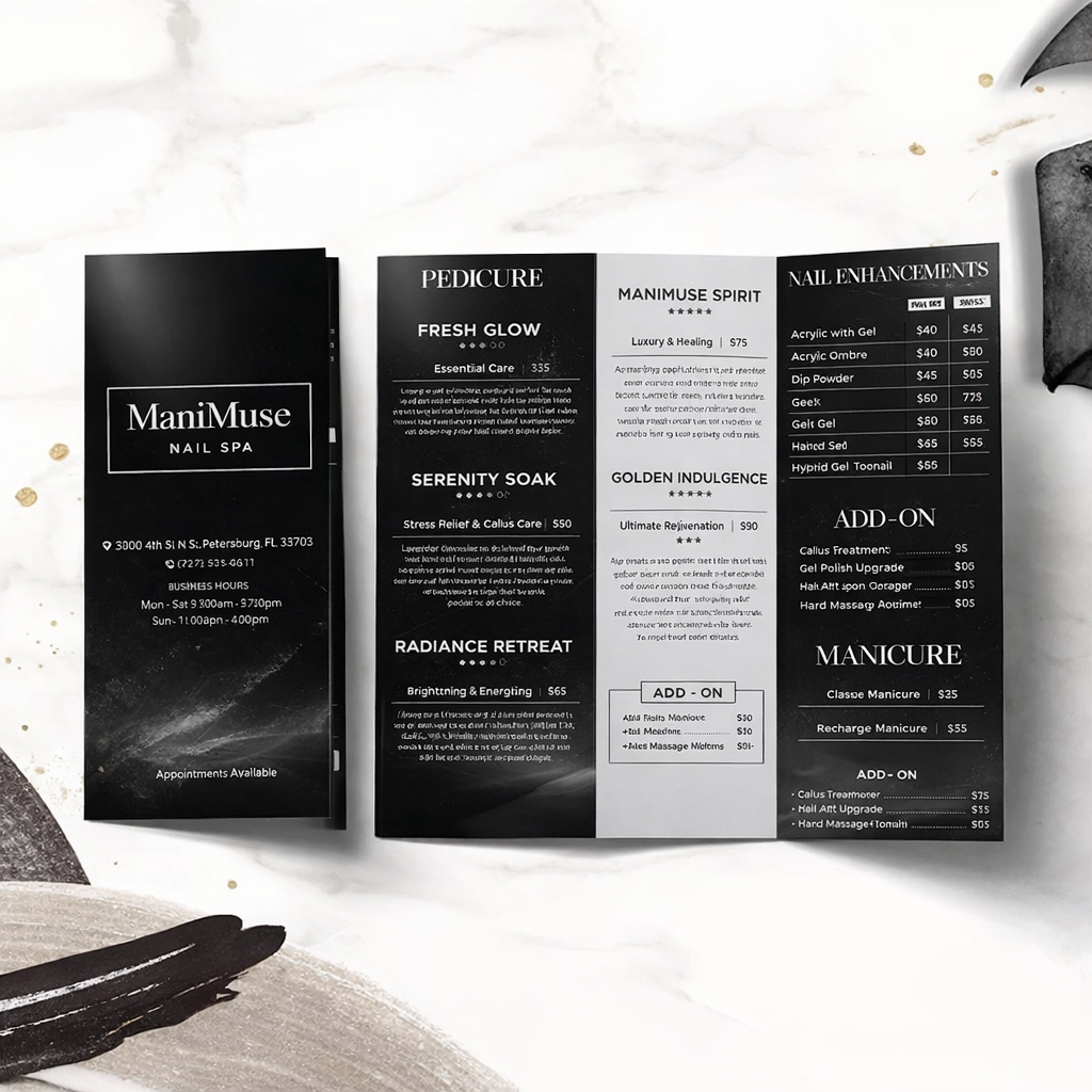 Thiết kế gọn gàng, sang trọng giúp menu phù hợp sử dụng tại tiệm nail, spa hoặc salon làm đẹp, giúp khách hàng dễ dàng theo dõi thông tin dịch vụ.