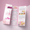 Menu được thiết kế dạng gấp cửa sổ, giúp trình bày nhiều nội dung dịch vụ trên cùng một menu nhưng vẫn gọn gàng và dễ xem. Kiểu menu này thường được sử dụng tại tiệm nail, spa hoặc salon làm đẹp để giới thiệu bảng giá dịch vụ và các mẫu nail.
