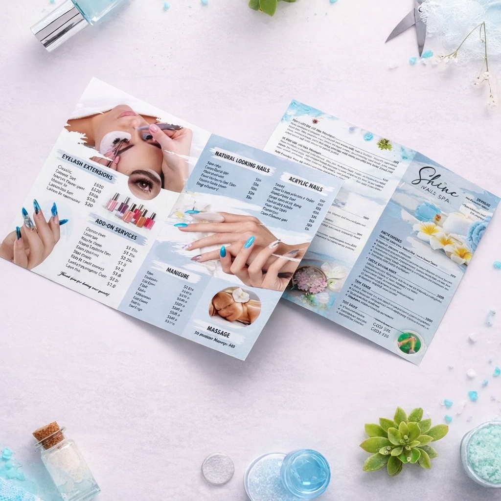 Menu dịch vụ được thiết kế dạng gấp đôi, giúp trình bày nội dung dịch vụ một cách gọn gàng, rõ ràng và dễ theo dõi. Kiểu menu này phù hợp sử dụng tại spa, nail, thẩm mỹ viện, salon làm đẹp hoặc trung tâm chăm sóc da để giới thiệu bảng giá và các liệu trình chăm sóc.