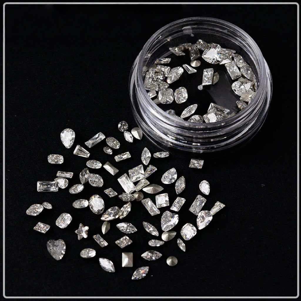 Set đá nail zircon mini cao cấp với thiết kế đế nhọn sắc nét, bề mặt cắt đa giác giúp phản chiếu ánh sáng mạnh, tạo hiệu ứng lấp lánh sang trọng trên móng. Sản phẩm phù hợp cho các mẫu nail đính nổi, nail luxury và thiết kế nail nghệ thuật chuyên nghiệp.