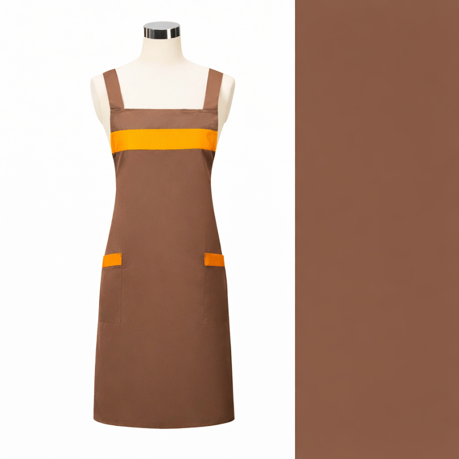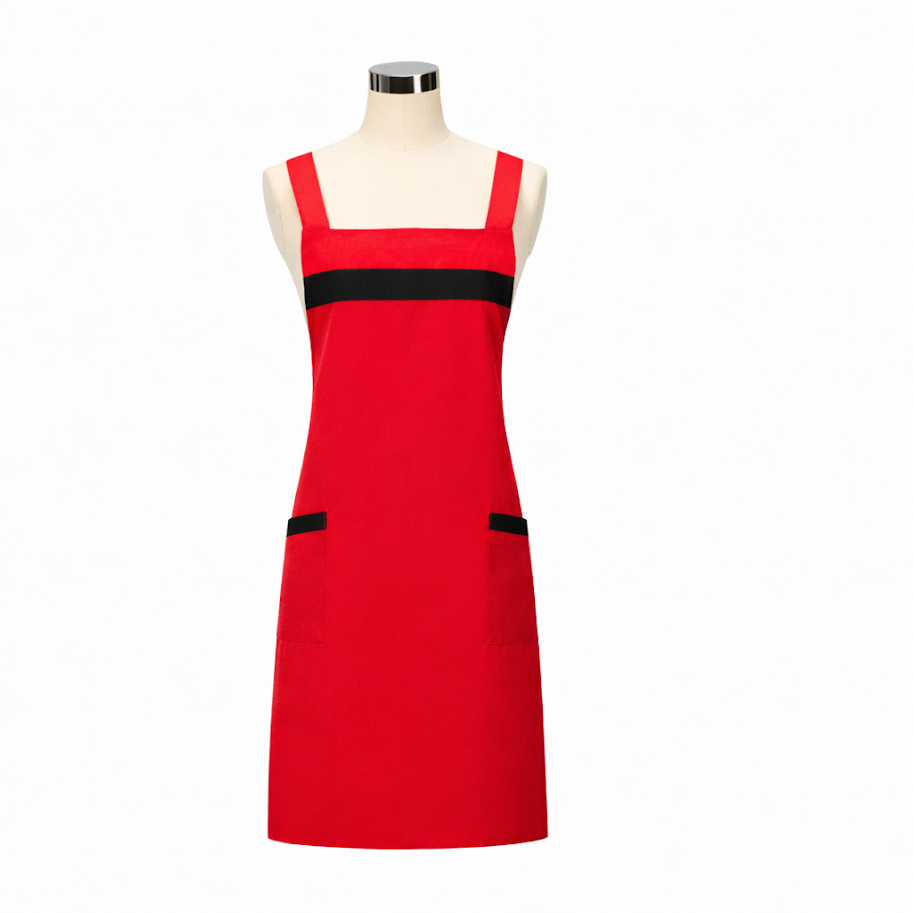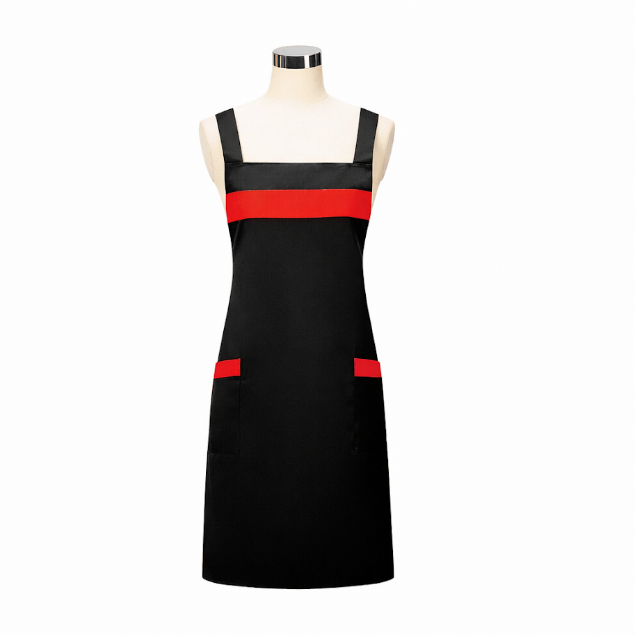 Tạp dề yếm thiết kế phối màu hiện đại, tạo điểm nhấn nổi bật với các đường viền và dải màu tương phản, giúp người mặc trông chuyên nghiệp và thu hút hơn trong môi trường làm việc.