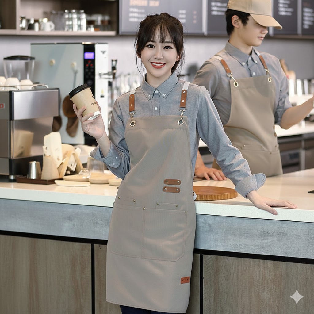 Tạp dề vải denim được thiết kế theo phong cách trẻ trung – hiện đại, phù hợp cho các mô hình dịch vụ cần hình ảnh năng động, thân thiện nhưng vẫn chuyên nghiệp như quán cà phê, nhà hàng, spa, tiệm bánh, salon. Chất denim dày dặn, đứng form giúp nhân viên mặc đẹp và thoải mái khi làm việc.